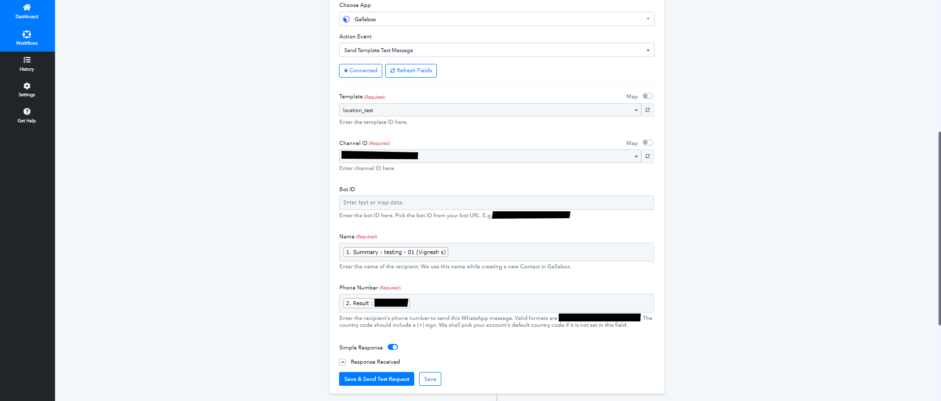 8. Choose the desired WhatsApp Template message to send, the channel Id you would want to send the WhatsApp Template message from, Bot Id (if you would like to trigger a bot), Name of the Recipient (it will be used to create a contact in Gallabox), Phone Number of the Recipient, and any variables defined in the WhatsApp Template Message.&#x20;