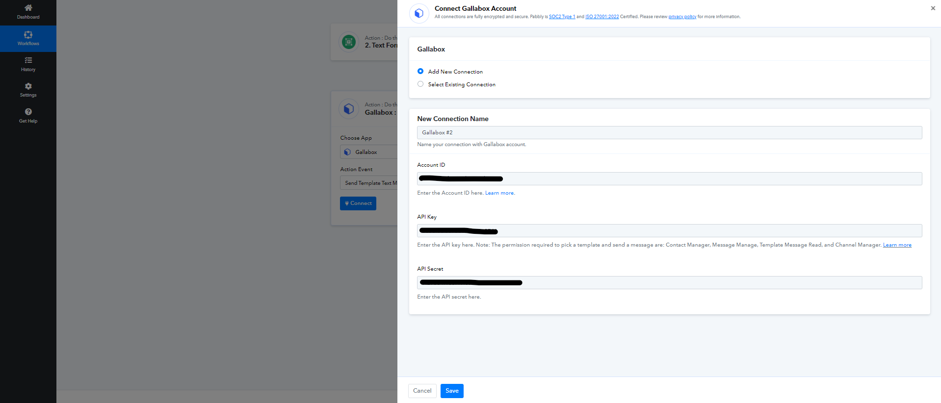 7. To connect your Gallabox account, add your Account Id, API Key, and API Secret. Once done click on Save.&#x20;