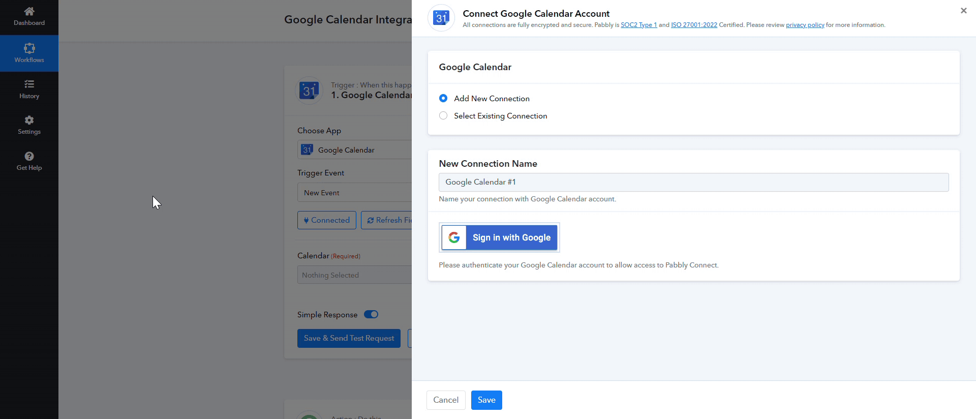1. In Pabbly Connect dashboard, click on Create Workflow. Name the workflow as "Google Calendar Integration" or any name desired. Selecting folder to keep this workflow in is optional.&#x20;