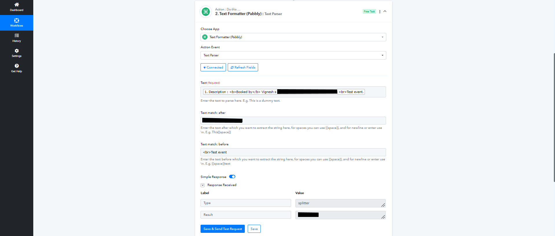 5. To extract the attendee's phone number from the description and send the WhatsApp message, use the "Text Formatter by Pabbly". For Action Event, choose Text Parser and specify the text before and after the phone number. The parser will then extract the number in between.